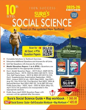 The SURA’s 10th Std Social Science Guide is a complete and updated study material created according to the latest Samacheer Kalvi syllabus. It covers History, Geography, Civics, and Economics with clear Tamil/English explanations (as per medium), chapter summaries, and detailed answers to help students prepare effectively for the SSLC Public Examination.